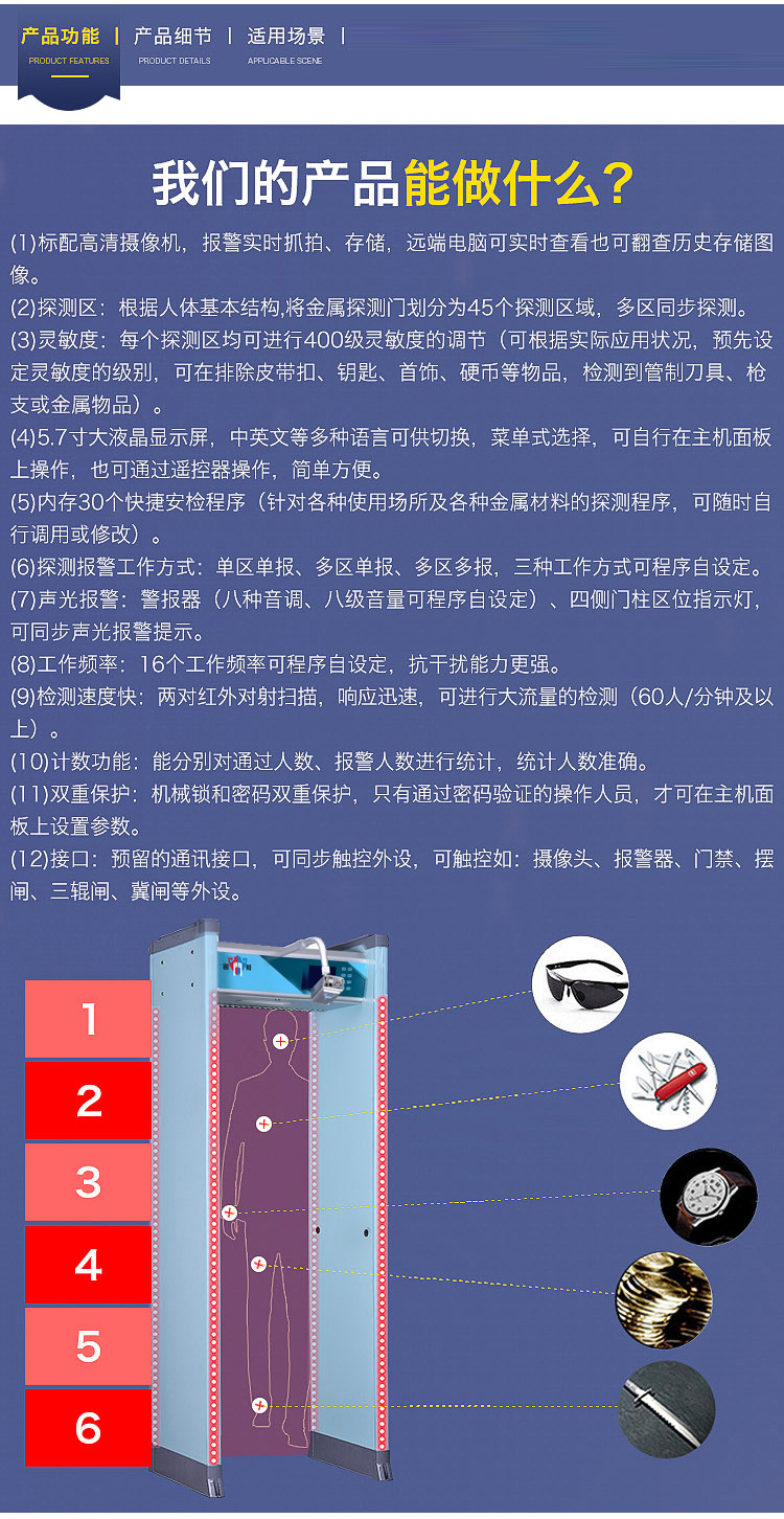 (3)、靈敏度:每個(gè)探測(cè)區(qū)均可進(jìn)行400級(jí)靈敏度的調(diào)節(jié)(可根據(jù)實(shí)際應(yīng)用狀況,預(yù)先設(shè)定靈敏度的級(jí)別,可在排除皮帶扣、鑰匙、首飾、硬幣等物品,檢測(cè)到管制刀具、槍支或金屬物品)。