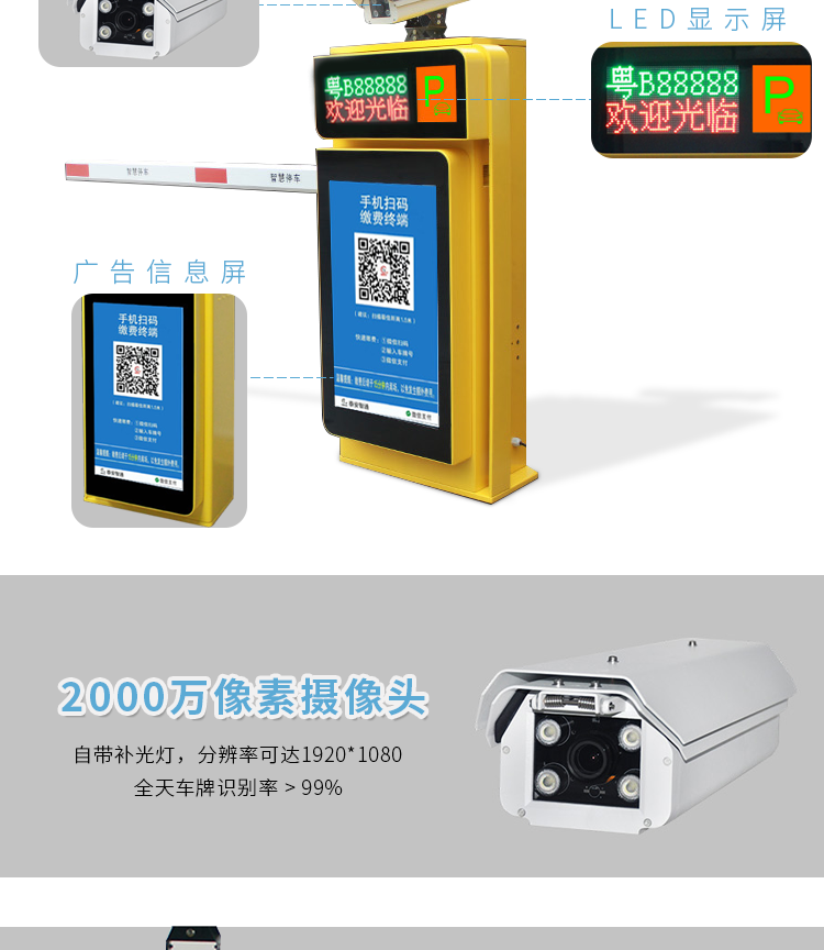 200萬像素攝像頭,自帶補光燈,全天候車牌識別率大于99%;