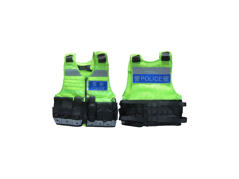 前胸、后背、下擺處有反光帶,肩部、腰部通過毛刺、三檔扣調節大小,下擺縫制手電、手銬、伸縮棍、工作包等單警裝備插袋。