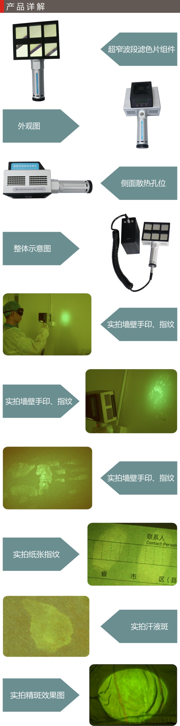 產品用途:超級物證發(fā)現(xiàn)儀,用于現(xiàn)場大范圍搜索精斑、尿液斑、唾液、陰道分泌物、血斑等生物檢材(不破壞DNA)及纖維、脫落細胞、骨骼牙齒碎片、油漆碎片、潛在手印、射擊殘留物等物證,也可以無損直接顯現(xiàn)部分客體上的手印指紋,潛在痕跡搜索,纖維,茚三酮/DFO羅丹明等處理過熒光染色等,大大提高現(xiàn)場物證發(fā)現(xiàn)提取率和區(qū)別能力。